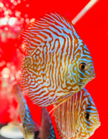 All of our Discus are bred and raised in Tap Water. Our PH is 7.4 and Temperature is between 84-86. Keeping your parameters consistent is key, dont chase the PH. We feed them pellets, flakes, brine shrimp, bloodworms and our Homemade Beefheart Mix! We recommend keeping them in Groups of 4-6. We throughly quarantine all new arrivals for atleast 3 weeks. Click here to see the variety of foods we feed in house.