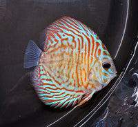 Beautiful Blue Tiger Carnation Discus, Blue throughout the body with vertical patterns. Bred by World Famous Martin Ng.
