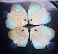 All of our Discus are bred and raised in Tap Water. Our PH is 7.4 and Temperature is between 84-86. Keeping your parameters consistent is key, dont chase the PH. We feed them pellets, flakes, brine shrimp, bloodworms and our Homemade Beefheart Mix! We recommend keeping them in Groups of 4-6. We throughly quarantine all new arrivals for atleast 3 weeks. Click here to see the variety of foods we feed in house