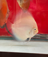 One of our all time favorites, White Diamond Discus. White throughout the body with Blue Halo around the outer fins. These Snow Whites will never pepper.