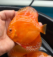 F1 Albino Alenquer Discus. These are F1 Wild Cross Albino Alenquers. No need for special RO water. These can be mixed with domestic fish with no issues at all.