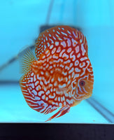All of our Discus are bred and raised in Tap Water. Our PH is 7.4 and Temperature is between 84-86. Keeping your parameters consistent is key, dont chase the PH. We feed them Discusfood pellets, flakes, brine shrimp, bloodworms and our Homemade Beefheart Mix! We throughly quarantine all new arrivals for atleast 3 weeks. Click here to see the variety of foods we feed in house