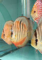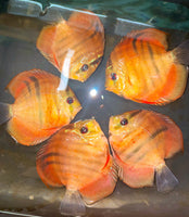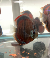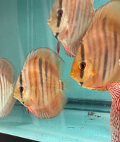 All of our Discus are bred and raised in Tap Water. Our PH is 7.4 and Temperature is between 84-86. Keeping your parameters consistent is key, dont chase the PH. We feed them pellets, flakes, brine shrimp, bloodworms and our Homemade Beefheart Mix! We recommend keeping them in Groups of 4-6. We throughly quarantine all new arrivals for atleast 3 weeks. Click here to see the variety of foods we feed in house.