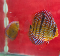 All of our Discus are bred and raised in Tap Water. Our PH is 7.4 and Temperature is between 84-86. Keeping your parameters consistent is key, dont chase the PH. We feed them Discusfood pellets, flakes, brine shrimp, bloodworms and our Homemade Beefheart Mix! We throughly quarantine all new arrivals for atleast 3 weeks. Click here to see the variety of foods we feed in house