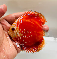 Deep rich Red Rafflesia Discus. Honeycomb pattern in the front and solid deep red on the end. Patterns will vary. Bred by World Famous Martin Ng!