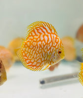Beautiful tight honeycomb patterns on these Yellow/Golden Jaguar Discus. A YCID Exclusive. Limited Quantities Available.