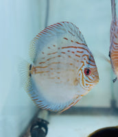 All of our Discus are bred and raised in Tap Water. Our PH is 7.4 and Temperature is 84. Keeping your parameters consistent is key, dont chase the PH. We feed them Discusfood pellets, flakes, brine shrimp, bloodworms and our Homemade Beefheart Mix! We throughly quarantine all new arrivals for atleast 3 weeks. Click here to see the variety of foods we feed in house