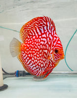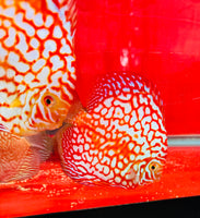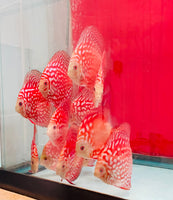 Introducing the magnificent Blood Eagle Discus, featuring vibrant red coloring for a striking appearance in any aquarium. With its stunning looks and lively personality, this fish is sure to captivate and enhance your underwater world. Bring home the beauty of the Blood Eagle Discus today! If you are after a beautiful Red, these Blood Eagles are our top sellers. Deep Red with white spots on the body. The absolute best from World Famous Martin NG Discus.