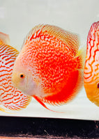 All of our Discus are bred and raised in Tap Water. Our PH is 7.4 and Temperature is between 84-86. Keeping your parameters consistent is key, dont chase the PH. We feed them pellets, flakes, brine shrimp, bloodworms and our Homemade Beefheart Mix! We recommend keeping them in Groups of 4-6. We throughly quarantine all new arrivals for atleast 3 weeks. Click here to see the variety of foods we feed in house