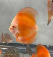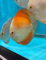 All of our Discus are bred and raised in Tap Water. Our PH is 7.4 and Temperature is between 84-86. Keeping your parameters consistent is key, dont chase the PH. We feed them pellets, flakes, brine shrimp, bloodworms and our Homemade Beefheart Mix! We recommend keeping them in Groups of 4-6. We throughly quarantine all new arrivals for atleast 3 weeks. Click here to see the variety of foods we feed in house.